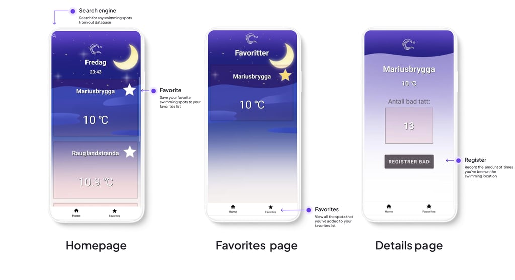 For the project in the "Software Engineering with Project Work" course, I worked with a team of five to develop an Android app that provides information on swimming locations in Norway, including live temperature updates from the Meteorological Institute. The app is designed for students aged 18-25.